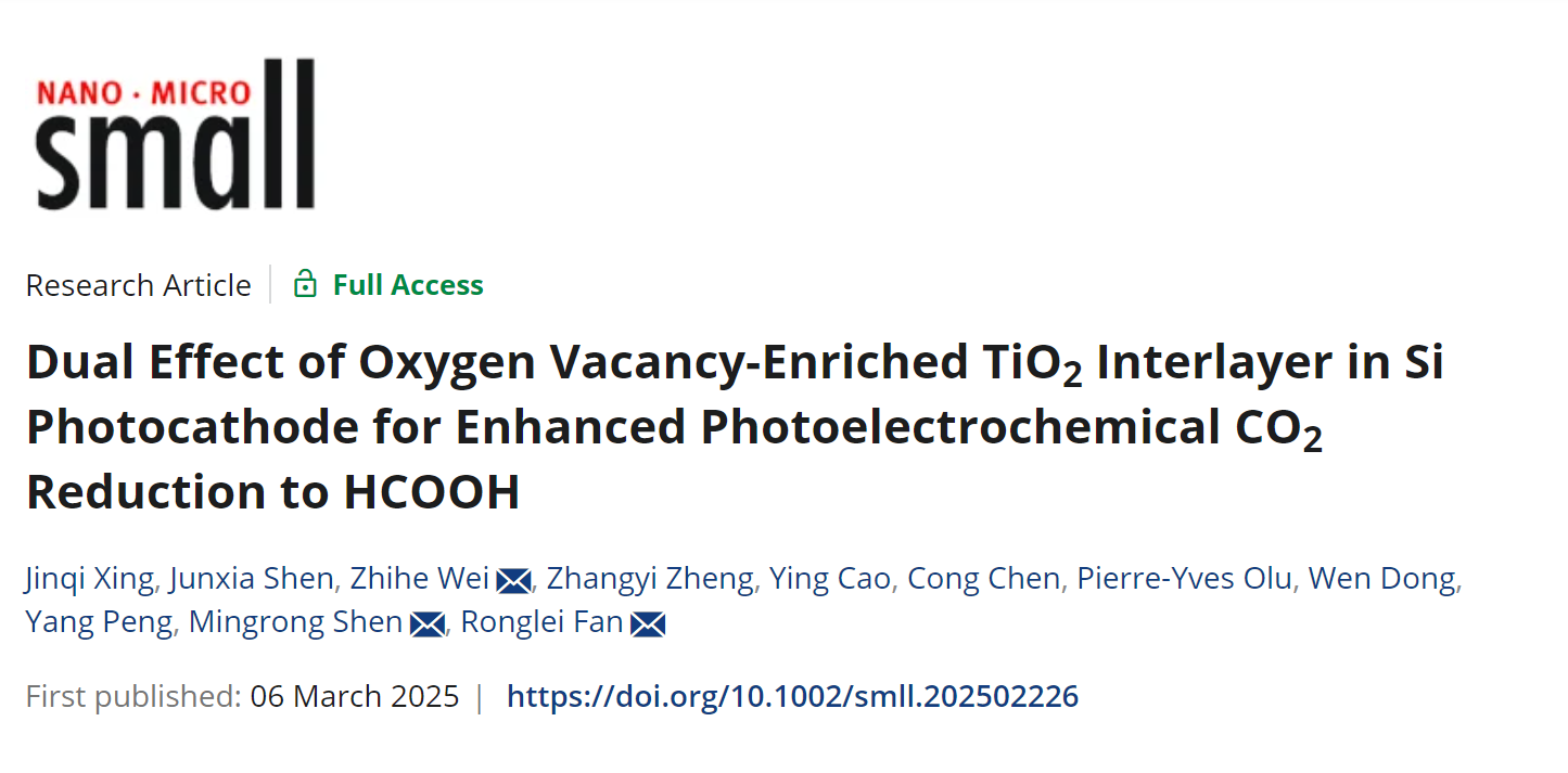 为第一单位,以“Dual Effect of Tuning the TiO2 Passive Layer Oxygen Vacancies of the Si Photocathode with Bi Nano-catalyst for Enhanced Photoelectrochemical CO2 Reduction to HCOOH”为题发表在Small上。