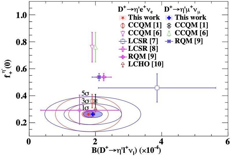 图1. D+→η'l+νl的分支比和形状因子测量值与不同理论计算比较