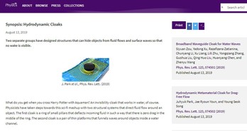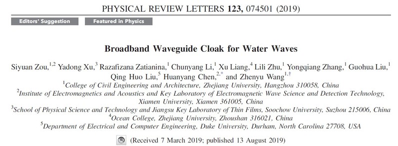该成果入选PRL封面故事及编辑推荐,并且被APS的Physics以“Hydrodynamic Cloaks”为题亮点报道。Physics World头版头条以“Broadband cloak controls water waves in harbours”为题报道该成果,Science News也以“New cloaking devices could hide objects from water waves and currents”为题做专访报道。