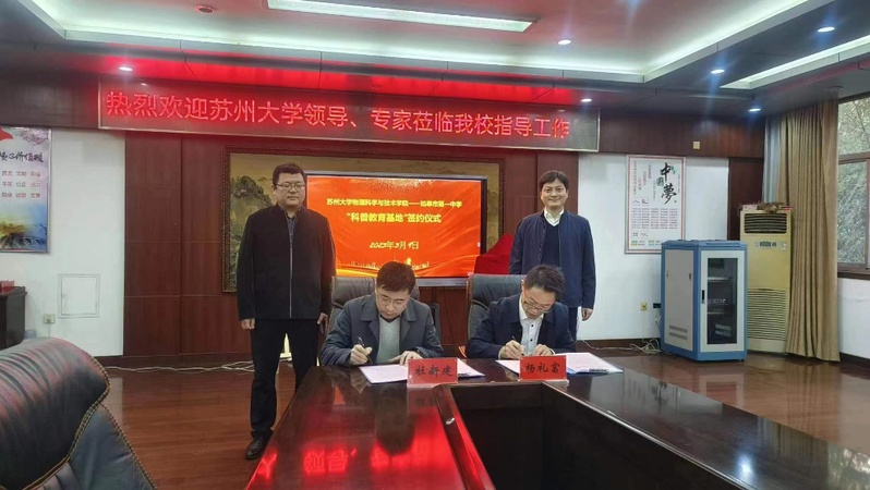 为积极贯彻落实习近平总书记关于“科技创新、科学普及是实现创新发展的两翼,要把科学普及放在与科技创新同等重要的位置”的重要讲话精神,拓展青少年的科技视野,积极发挥黄色影片 资源和人才优势,更好的承担社会服务的责任。3月9日,学院杨礼富书记、赵承良副院长赴如皋市第一中学参加双方科普教育基地共建协议的签订和“黄色影片 科普教育基地”“黄色影片 优质生源基地”的揭牌仪式,赵承良副院长还受邀参加第二期“如皋市第一中学科创大讲堂”并作了一场“神奇的激光”科普报告。如皋市第一中学杜新建校长、田利剑副校长热情接待了杨书记一行并参加了相关活动。