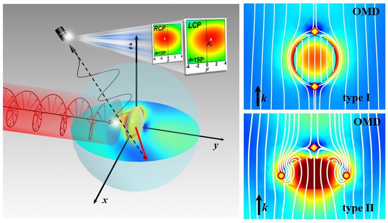 自旋轨道耦合与光的聚焦、散射或成像相关,是光子角动量守恒的体现。许多有趣的现象与自旋轨道相互作用密切相关。研究团队在之前提出的用对偶球纳米颗粒增强光的自旋霍尔位移(Laser & Photonics Reviews 12:1800130 (2018))的基础上,探究颗粒的形态变化对光自旋霍尔位移以及远场散射强度的影响。发现了对具有特定长短轴比值的椭球颗粒,散射强度可以有效地提高一个数量级,同时保持波长量级的自旋霍尔位移。研究团队还发现了一种对偶颗粒轨道动量流线的新模式。这种新模式可以解释近场奇异光学涡旋对远场自旋霍尔位移起源的作用。