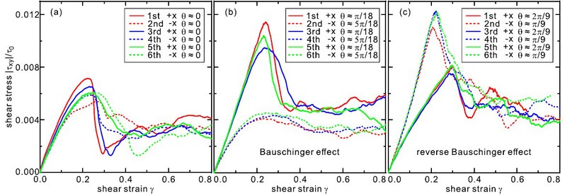 进一步研究发现,在多次正反循环剪切作用下,通过改变初始晶格取向,二维尘埃晶格分别表现出三种典型的行为,即几乎不存在包辛格效应、显著的常规包辛格效应、及反向包辛格效应,如图3所示。这是在尘埃等离子体物理研究中首次明确发现其包辛格效应。这一结果表明,包辛格效应与反向包辛格效应在二维尘埃等离子体固体系统中均存在,且它们主要取决于系统的各向异性屈服。