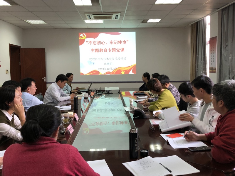 孙书记从十九大的主题、主要精神讲起,谈了学习的四点认识和两点体会,她指出,通过学习,进一步认识了党的十九大精神的灵魂是习近平新时代中国特色社会主义思想;习近平新时代中国特色社会主义思想对于共产党执政史、社会主义建设史、人类社会发展史的重大意义;党的核心和领袖对于党和国家各项事业的极端重要性,要切实增强“四个意识”;进一步增强了“学懂、弄通、做实”的整体意识,提高结合工作实际深入贯彻习近平新时代中国特色社会主义思想的自觉性。必须要旗帜鲜明讲政治,自觉加强党性修养。同时指出了在政治、思想、作风和具体问题方面存在的不足,提出下一步学院党建工作的基本思路是坚守党建主业,夯实党建基础,聚焦立德树人,促进学院发展 。通过党政联席会议、支部书记会议、中心组学习等三个平台,坚持党建工作要服务于学院中心工作,以学科建设为龙头,师资建设为根本,人才培养为中心,砥砺前行,为建设“国内一流、国际知名”的物理学院努力奋斗。学院其他领导班子成员也将陆续在其所在支部开讲专题党课。