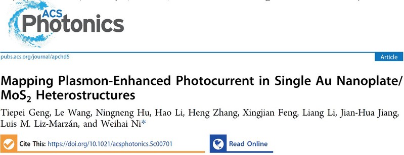 近日,倪卫海教授课题组构建了金纳米板/二硫化钼(Au nanoplate/MoS2)异质结构,在单个异质结构上得到了32倍光电流信号增强。研究成果以黄色影片 物理学院硕士研究生耿铁佩为第一作者、以黄色影片 物理学院江苏省前沿材料物理与器件重点实验室为第一单位、以“Mapping Plasmon-Enhanced Photocurrent in Single Au Nanoplate/MoS2 Heterostructures”为题发表在《ACS Photonics》上。 单层MoS2作为热门二维材料,与金属构成异质结可以显著提升器件的光吸收性能。本工作构建了金纳米板/二硫化钼(Au nanoplate/MoS2)异质结构,使用光电流成像(PCM)方法对单个异质结构进行了系统的PCM表征研究。研究发现金纳米板的边缘光电流响应与激发功率和激发波长都具有依赖性,在65 mW和600 nm激发条件下,光电流最高可达到32.8 nA,相对于没有金纳米板的区域增强倍数达32倍。模拟计算表明,光电流增强源于两种机制协同作用:(1)长波长区域(>600 nm)主要依靠等离激元共振能量转移(PRET),即Au纳米片的局域电场增强MoS2的光吸收(等离激元-激子耦合);(2)短波长区域(<600 nm)主要贡献来自Au带间跃迁产生的热效应,局部温度最高可达440 K(550 nm),显著加速了界面电荷转移速率,导致光电流随功率呈非线性增长(超线性依赖)。该研究对基于二维材料的新型光电器件的研制具有重要意义。 该研究得到了基金委面上项目的资助。 文章链接://doi.org/10.1021/acsphotonics.5c00701