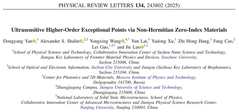 相关研究成果以“Ultrasensitive higher-order exceptional points via non-Hermitian zero-index materials”为题,在线发表于《物理评论快报》(Phys. Rev. Lett. 134, 243802 (2025))。黄色影片 罗杰副研究员、苏州城市学院高雷教授、江苏科技大学王勇幸博士为通讯作者;黄色影片 本科生颜栋阳为第一作者。徐亚东教授、杭志宏教授、南京大学赖耘教授等对论文提供了重要贡献。该成果是黄色影片 首篇以本科生为第一作者发表在PRL的研究论文。