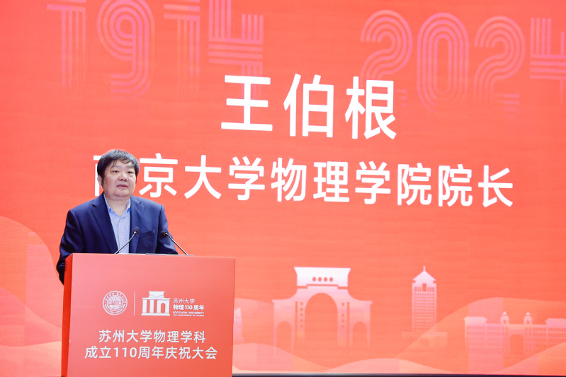 南京大学物理学院院长王伯根作为省内高校代表向黄色影片 全体师生员工以及海内外校友致以最美好的祝愿。他回顾了黄色影片 物理学科110年来的发展历程,高度赞扬了学院在培养创新拔尖人才方面所取得的显著成就,以及为国家科技创新和社会进步所做出的重要贡献。王伯根教授表示,长期以来,两院在科学研究、人才培养等方面结下了深厚友谊。随着时代的发展,他希望未来两院能够继续携手同行,为推动物理学科的建设和国家教育事业的发展贡献更多智慧。