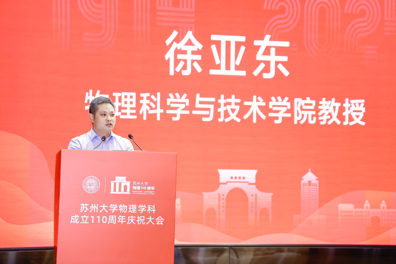 本硕博均毕业于苏大物理学院、2022年教育部青年人才获得者徐亚东教授作为教师代表发言,他向长期以来关心支持物理学科的领导以及为学院建设付出艰辛努力的历届校友表示了诚挚的感谢。他回顾了自己在学院20年间的学习与工作生活,见证了学院在学科建设、科学研究、人才培养等方面的飞速发展。他表示,无论时代如何变迁,对知识的守候与追求始终是教育者不变的初心,要秉持“养天地正气,法古今完人”的校训,坚持“格物致理,尚德笃行”的物理精神,全面落实立德树人的根本任务,为培养具有国际视野和创新精神的高素质人才而不懈努力。
