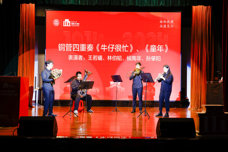 庆祝大会正式开始前,同学们为大家带来了萨克斯演奏、铜管五重奏、诗歌朗诵等三个节目。随后大会在庄严的国歌声中正式拉开帷幕。