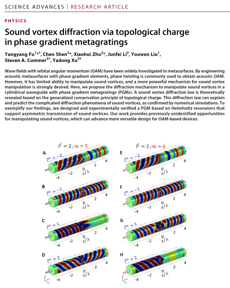 近日,徐亚东教授团队以“Sound vortex diffraction via topological charge in phase gradient metagratings”为题,在《Science Advances》发表论文。在之前研究成果(Y.Xu et al. Nat. Commun. 10, 2326 (2019))基础上,把发现的奇偶性相关的“光栅衍射新规律”从“自由空间”拓展到三维圆柱波导“受限空间”,创新地提出“广义拓扑荷守恒原则”,揭示了操控轨道角动量新的自由度,为操控“受限空间”中涡旋波的OAM提供了新的理论基础。在此基础上,研究团队设计并开展声波实验研究,验证了一种不对称涡旋波传输器件,该器件在基于OAM通信方面具有极大的应用价值。