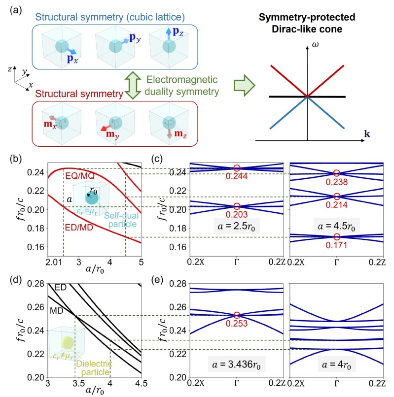类狄拉克锥是光子晶体中由线性能带与平带交叉形成的一种特殊色散结构,在零折射率材料等应用中具有重要价值。传统方法通过偶然简并构造的类狄拉锥点对结构参数极为敏感,缺乏鲁棒性。针对这一关键科学问题,本研究创新性地提出利用电磁对偶对称性保护类狄拉克锥的方案。通过对称性分析,分别基于自对偶颗粒、非自对偶颗粒簇,设计出了具有鲁棒性的类狄拉克锥的光子晶体。 相比传统偶然简并方案,这种新型类狄拉克锥展现出显著优势。特别地,研究首次发现在同一晶格常数下可存在多个对称性保护的类狄拉克锥。本研究建立了电磁对偶对称性与狄拉克物理之间的内在联系,为设计具有特定色散特性的光子晶体开辟了新途径。