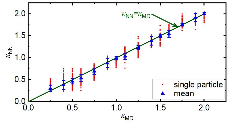 通过朗之万动力学方法模拟不同κ值下的二维尘埃等离子体,获得一系列不同κ值下单颗粒动力学数据,这些数据被用于训练、验证和测试设计的CNN。经过大量的单颗粒动力学数据训练后,CNN成功地从模拟得到的单颗粒动力学数据中确定了系统的κ值,与模拟设定的κ值匹配得很好,如图2所示。图2中,横轴为模拟二维尘埃等离子体时选定的κ值,每个选定的κ值都包含随机选定的512个颗粒运动信息,纵轴是训练好的CNN分析给出的κ值。图中每个红点均是CNN基于单个尘埃颗粒动力学信息分析出的结果,同时,蓝色三角则是每个κ值分析结果的平均值。图中结果显示,与模拟设定的κ值相比,CNN给出512个κ值分析结果的均方根误差仅为0.081,充分证明了通过机器学习从单颗粒动力学信息直接得到系统全局性质参量的可行性和准确性,也体现了“一叶知秋”古老东方哲学的智慧。