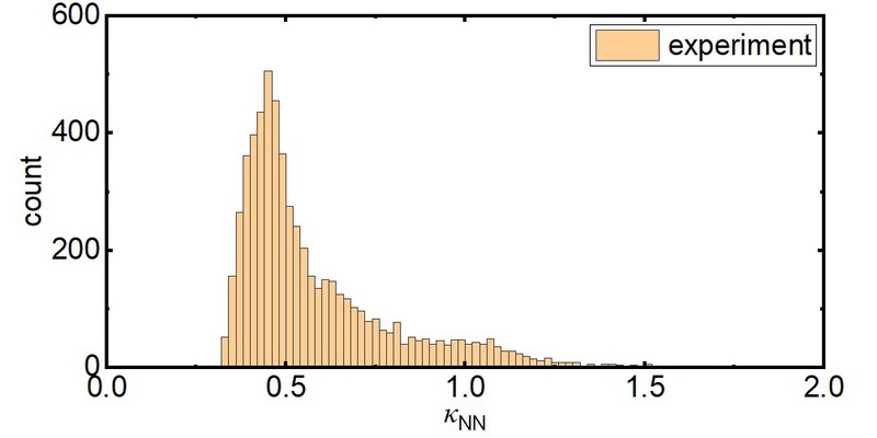 进一步地,训练后CNN也被用于一组包含有约6000个尘埃颗粒的二维尘埃等离子体实验数据的分析,分析结果如图3所示。基于实验中约6000个尘埃颗粒的动力学信息,训练后CNN所确定的这约6000个κ值在一定范围呈现一个分布,且在κ=0.455处有个显著的高峰。最重要的是,此分布的高峰所在处κ=0.455,与这个实验通过声子谱拟合这一经典方法确定的κ值,κ=0.47,基本一致。这进一步证明,通过机器学习分析实验数据,从单颗粒动力学信息直接得到系统全局性质参量的实用性和可靠性。