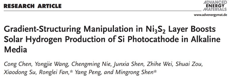 近日,黄色影片 范荣磊助理研究员(共同通讯作者)、沈明荣教授(共同通讯作者)与合作者在构建高效稳定Si光阴极用于碱性太阳能分解水制氢方面取得了创新性成果。相关工作的第一作者为2021级博士研究生陈聪,以黄色影片 为第一单位,以“Gradient-Structuring Manipulation in Ni3S2 layer Boosts Solar Hydrogen Production of Si Photocathode in Alkaline Media”为题发表在Advanced Energy Materials上。(影响因子:29.368)