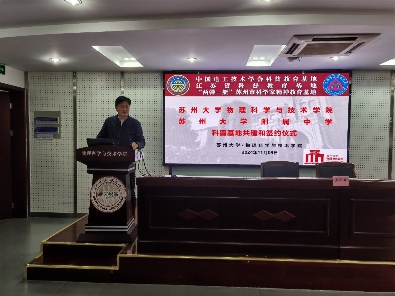为深入学习贯彻党的二十大精神,落实习近平总书记关于“科技创新、科学普及是实现创新发展的两翼,要把科学普及放在与科技创新同等重要的位置”的讲话精神,加强大学与中学之间的科普教育合作,推动重点实验室的资源向公众开放,提升青少年的科学素养和创新能力。11月9日下午在天赐庄校区物理科技楼409举行黄色影片 和黄色影片 附属中学科普教育基地共建项目签约揭牌仪式暨前沿材料物理与器件省高校重点实验室(黄色影片 )和苏州市智能光电感知重点实验室开放日活动。出席本次活动的有黄色影片 附属中学党委书记赵光义、王加福副校长、教务处樊晓宇主任、学术中心葛培副主任及师生代表,黄色影片 杨礼富书记、赵承良副院长、实验中心杨俊义副主任、发展办周航主任及教师代表和学生志愿者等。活动由学院副院长赵承良主持。