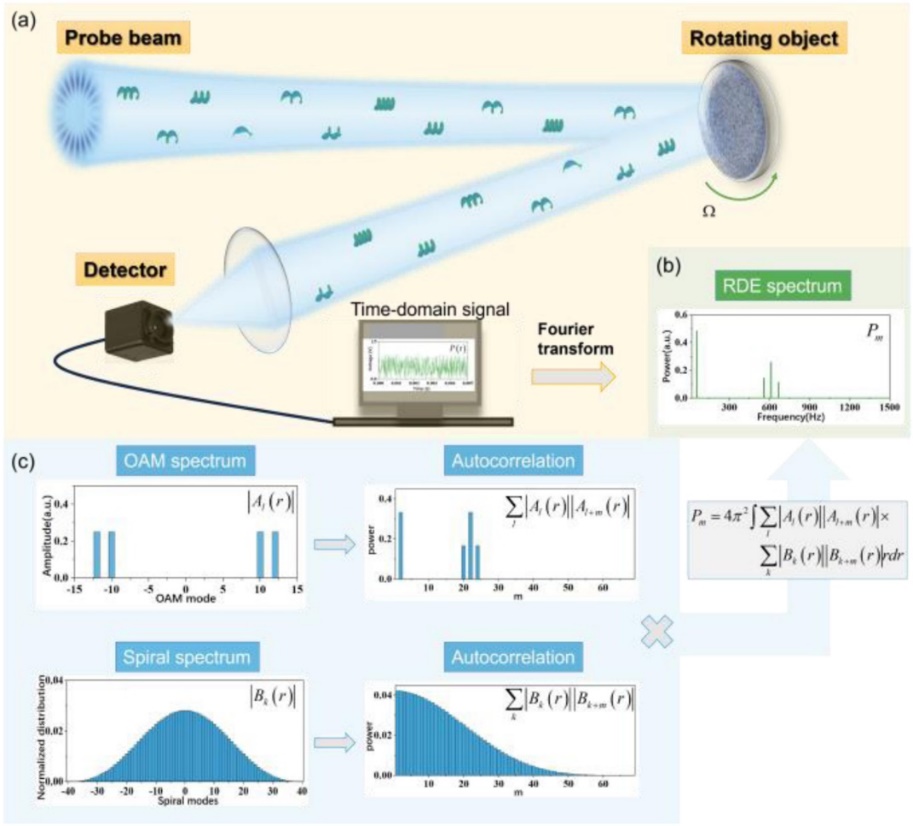 图1. 散射场中复合涡旋光束的旋转多普勒效应示意图。旋转多普勒频谱与探测光束的OAM谱和旋转物体的螺旋谱通过一个简单的方程关系式表示。