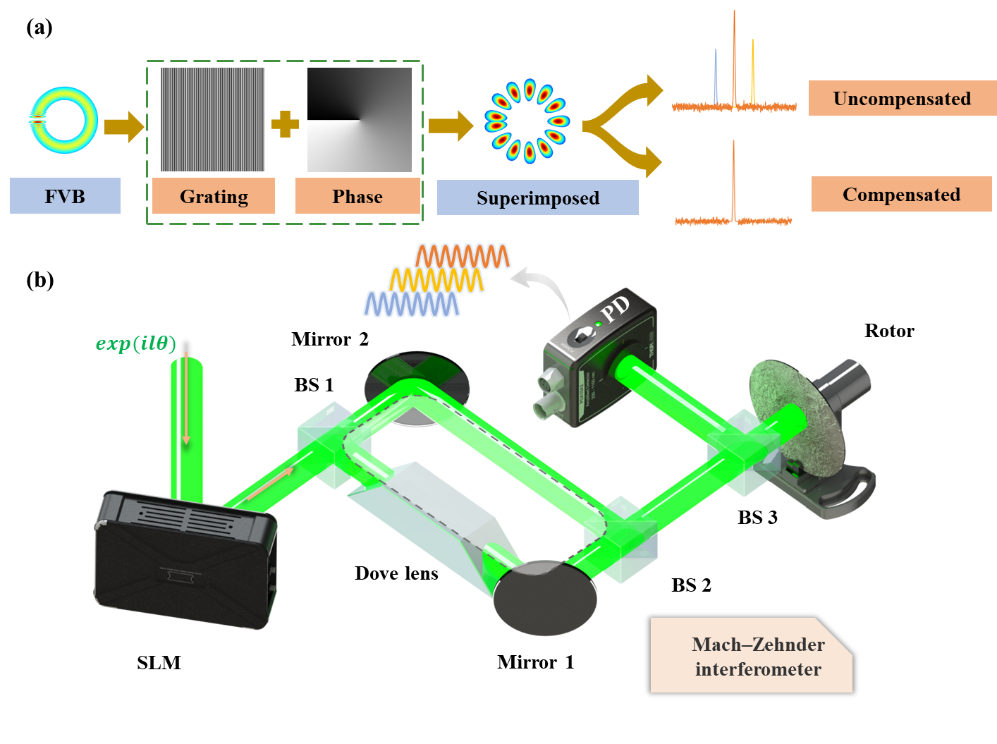 本工作使用未滤波的多模接收方案。理论分析表明,散射光的旋转多普勒频谱是探测光束OAM谱的自相关函数与旋转物体螺旋谱的自相关函数的乘积(图1)。其物理意义在于空间滤波散射光的单模接收减少了交叉耦合效应,只保留了部分信号。而在未滤波的多模接收情况下,从旋转多普勒频谱中可推断出更丰富的信息。并且由于所有交叉耦合项的完备性,该旋转多普勒频谱更适合具有特殊螺旋频谱的旋转物体,也有助于减少接收系统振动对旋转多普勒频谱的影响。实验结果表明,对于不同OAM谱的探针光束,其散射光的旋转多普勒频谱也会发生相应改变。通过调整OAM谱,改变光束光斑强度和相位分布,几乎可消除因光轴与物体转轴失准引起的旋转多普勒频谱展宽,实验误差小于1.2 %。该模型有助于深入理解旋转多普勒频谱展宽的物理机制和频谱特性,并为自相关与互相关的全光计算奠定基础。这一理论框架还使得通过旋转多普勒频谱反向分析旋转物体表面特性成为可能。
