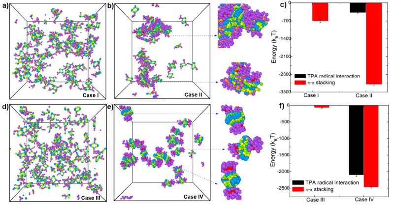 最近,软凝聚态物理及交叉研究中心丁泓铭副教授(共同通讯作者)与华东师范大学杨海波教授、史学亮研究员合作,在自由基诱导超分子逐级自组装方面取得重要进展,相关工作以“Radical-Induced Hierarchical Self-Assembly Involving Supramolecular Coordination Complexes in Both Solution and Solid States”为题发表在美国化学会旗舰期刊[J. Am. Chem. Soc., 141, 16014-16023 (2019)]。在这项工作中,华东师范大学杨海波教授课题组从实验上提出了一种新型超分子自组装方法——在金属大环侧链引入三苯胺基团(TPA),并通过光照诱导三苯胺间的自由基作用来调控金属大环在不同介质中的组装行为。为了进一步从微观尺度上理解上述自组装过程的物理机制, 丁泓铭副教授采用分子动力学模拟方法构建和刻画了上述分子在不同条件下的相互作用过程,详细讨论了金属大环及三苯胺基团对自组装形貌的影响,尤其揭示了只有当金属大环上p-p堆积作用与侧链TPA自由基相互作用达到一定平衡时,层状堆叠方式才会产生。相关模拟结果很好地解释了实验中的现象。
