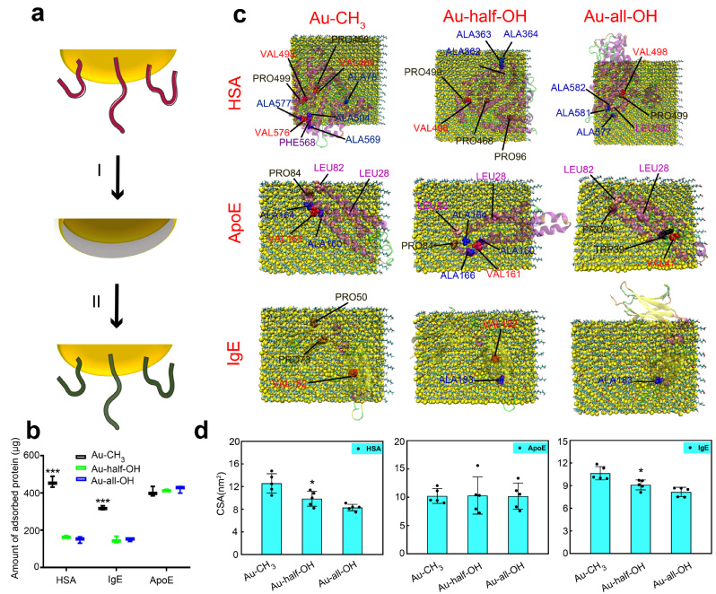 在这项工作中,作者首先通过全原子分子动力学模拟研究了三种典型血浆蛋白(HSA,IgE, ApoE)与不同表面修饰的石墨烯作用机理。研究发现,随着石墨烯表面羟基数目的增多,HSA与IgE的吸附面积逐渐下降(图1a-b);而ApoE的吸附面积却与石墨烯表面羟基数目无明显关联(图1c)。通过进一步分析蛋白质吸附到石墨烯上的构象,我们发现二级结构的变化是影响蛋白质吸附面积的关键因素——对于具有疏水内核结构的HSA和以beta片为主的IgE而言,随着纳米材料亲水度的增加,二级结构破坏逐渐减弱,从而吸附面积逐渐降低;而对于以alpha结构为主和亲疏水相间的ApoE而言,亲水和疏水表面对其二级结构的破坏无明显差别,从而其吸附面积没有太大区别(图1d)。以上结果也得到了蛋白质体外吸附实验的证实(图1e),即通过调控纳米材料表面亲疏水性可以有效地调控纳米材料的蛋白冠成分。此外,我们还以金纳米材料为例,进一步地证明了我们结果的普适性(图2)。
