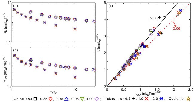 本项研究工作化繁为简,将每个原子失去或获得一个最近邻的平均时间,这一较容易观测的拓扑事件,定义为局域连通寿命\tau _{LC}。团队通过将Frenkel的液体描述与原子局域连通寿命相结合,理论推导出二维液体黏度等于质量密度、颗粒平均速率的平方、局域连通寿命三者之积,再乘以一个与系统相互作用相关并趋近于1的系数。为了验证这一公式的普适性,团队在三种相互作用迥异的二维液体系统(Lennard-Jones,Yukawa,Coulomb)中进行了不同参数条件下的大规模模拟和数据分析。研究结果显示,尽管这些系统的相互作用从短程吸引排斥的Lennard-Jones到中程Yukawa排斥,甚至到长程的库仑排斥各不相同,但不同参数下三类液体的黏度均准确地落在了上述黏度的解析表达式,如图2所示。