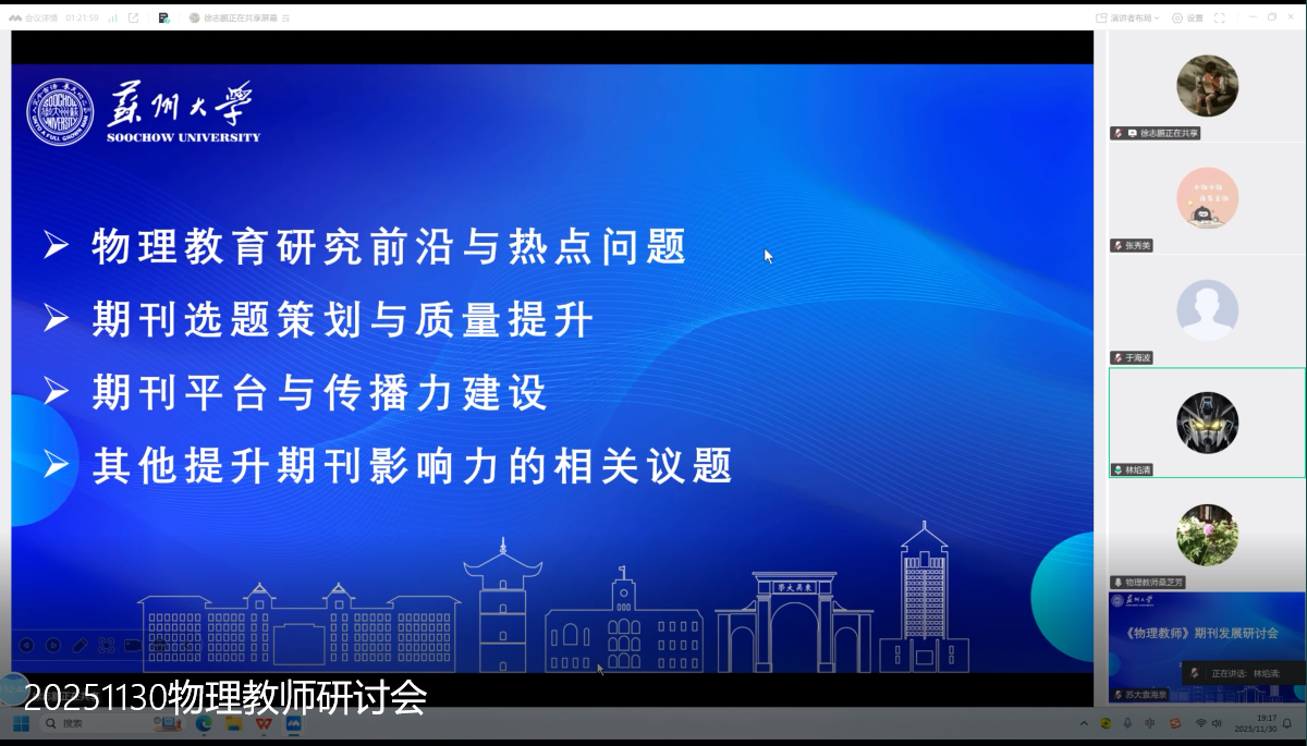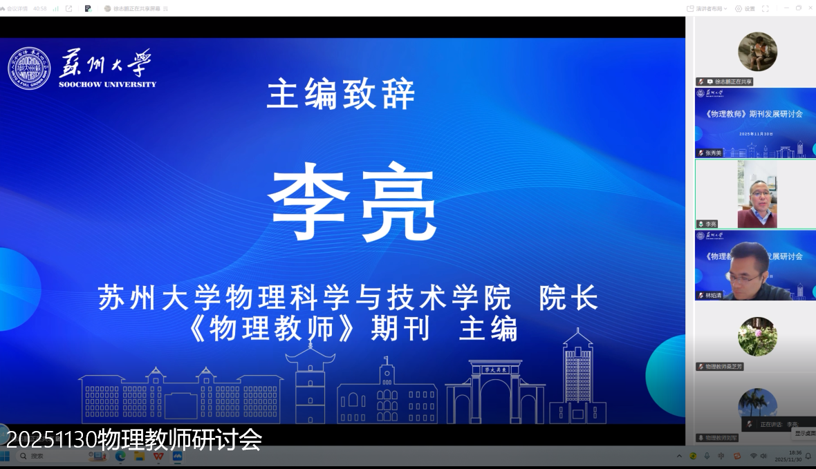 11月30日,《物理教师》期刊发展研讨会以线上会议形式成功举办。作为展示、交流物理教研成果的核心载体和重要平台,《物理教师》期刊是推动物理教育学术繁荣的重要力量。本次研讨会聚焦深化物理教育领域学术交流,明晰期刊未来发展路径,旨在全面提升办刊质量与学术影响力。