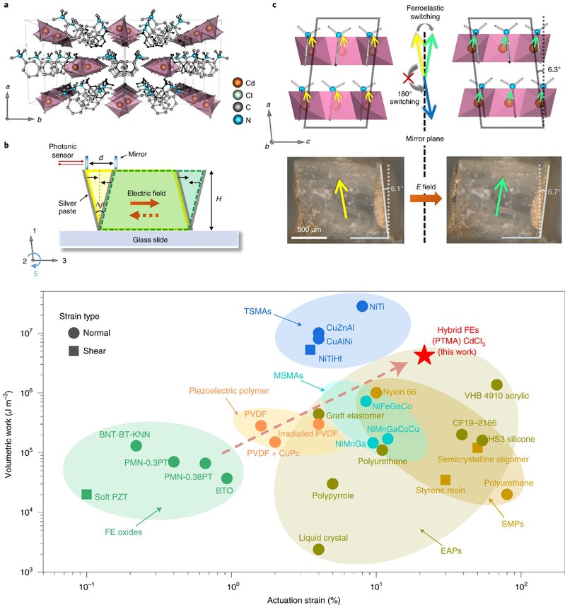 有机无机杂化铁电体近年来因为杂化钙钛矿的兴起,也引起了广泛关注。杂化铁电体由无机骨架和有机离子结合而成,因此具有不同于传统氧化物铁电材料的独特性质。在这项工作中,我们使用了体积较大的有机分子结合CdCl3-无机骨架,由于空间限域作用,这使得铁电极化的180度翻转被完全抑制了。铁电极化只能发生单一路径的小范围转动,引起铁弹相变,同时伴随着巨大的剪切应变(图一)。在常规氧化物铁电材料中,电致应变(轴向或剪切)的最大值通常只有0.1-1%,而此次发现的杂化铁电体产生的剪切应变超过了20%。同时,从微观原子尺度晶格的畸变(亚纳米)到宏观晶体的形变(毫米)实验上观测到了完美的契合。这种现象在块体压电材料中是难以想象的,这可以归因于杂化特性使其具有较软的机械性质,而这种较弱的分子间作用力(氢键、范德华力)也使得晶体具有较好的塑性变形能力。
