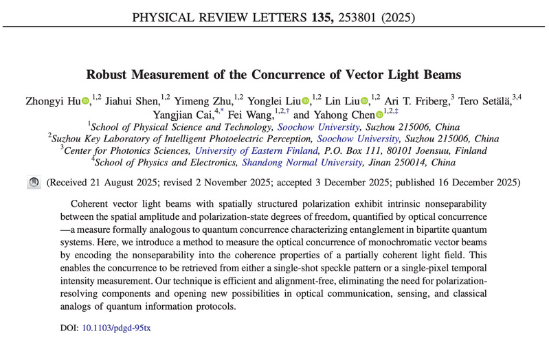论文信息:Zhongyi Hu, Jiahui Shen, Yimeng Zhu, Yonglei Liu, Lin Liu, Ari T. Friberg, Tero Setälä, Yangjian Cai, Fei Wang, and Yahong Chen, Robust measurement of the concurrence of vector light beams, Physical Review Letters 135, 253801 (2025).