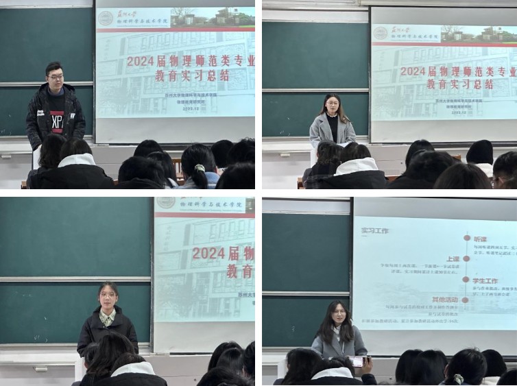 接下来,由本科实习生代表李亮、刘佳楠、施云天,研究生实习代表王佳琪同学,对本次实习经历进行交流和分享。他们都表示,近三个月的实习收获颇丰,在学科教学、班主任工作方面,都得到了来自实习学校、苏大指导老师的悉心指导,此次实习更坚定了他们成为优秀人民教师的理想信念。