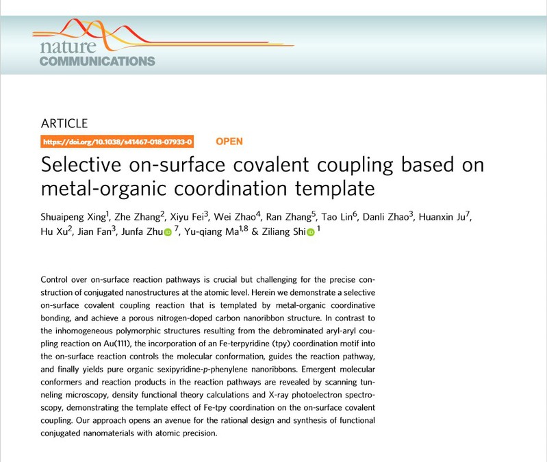 2019年1月,黄色影片 软凝聚态物理及交叉研究中心,物理学院石子亮副教授、马余强教授携手海内外多家研究机构,在Nature Communications上发表了题为“Selective On-Surface Covalent Coupling Based on Metal-Organic Coordination Template”的研究论文。