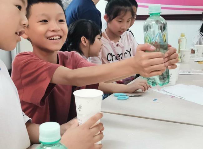 知觉中下沉又上浮,有的小朋友脸上已经露出了疑惑的表情,有的则惊奇地看着,还有个小朋友争着解释这其中的原理。在小朋友们还在互相展示自己的浮沉子时,志愿者接着从身后掏出了由两个纸杯粘合而成的道具,在他的操作下纸杯就像滑翔机一样划过上空,小朋友们纷纷抬头看,眼神跟随着“滑翔机”的轨迹而降落,这尤其吸引了男孩子的注意力,他们都跃跃欲试想要制作出那样飞得高高的“滑翔机”,不一会儿在志愿者的展示下,大家都做好了自己的“滑翔机”并在上面进行涂鸦,大家带着期待和新奇的目光一起放飞了自己“滑翔机”,脸上始终洋溢着幸福的笑容。