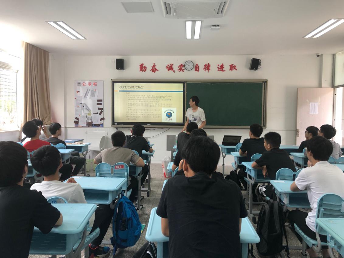 首先,“PT高中行”实践团队的主讲人简单的介绍了本次宣讲的主题:为在校的高一物理竞赛的学生们科普各种实践类的物理知识,体验实验的乐趣。同时也宣传了中学生物理学术创新竞赛(JSYPT)以及中国大学生物理学术竞赛(CUPT),为感兴趣的同学提供了询问通道。随着“PT高中行”实践团队成员们在同学们的热烈的掌声欢迎下,由一段本次宣讲所涉及的趣味实验视频合集拉开了科学宣讲的序幕。