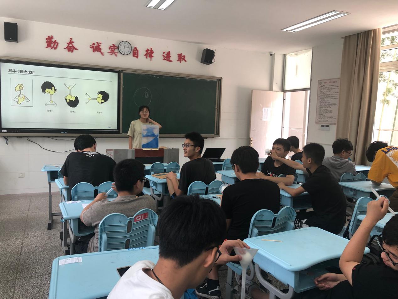 简单的认识了雪糕棍的世界,我们再来看看有趣的流体世界。主讲人张雨晴通过吹气使两张纸贴在一起引入伯努利原理的通俗推论:流速大,压强小;流速小,压强大。气体是流体,液体也是。我们也将带来的漏斗和球发给在座的各位同学,由他们自己吹气,来感受在高速气流中,小球无法从漏斗中脱离的神奇现象。基于传统的伯努利原理,同学们又会有怎样的思考呢?脱离此传统的原理,又有哪些地方需要补充的呢?引人深思的物理问题永远不会结束。