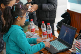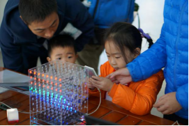 在“智能硬件互动”模块,设置有“桌面俄罗斯方块、光立方演示、Gamebuino游戏机”等项目。光立方则是由单片机控制512个LED灯的不同位置闪亮,夜晚更加Bling Bling。