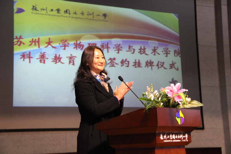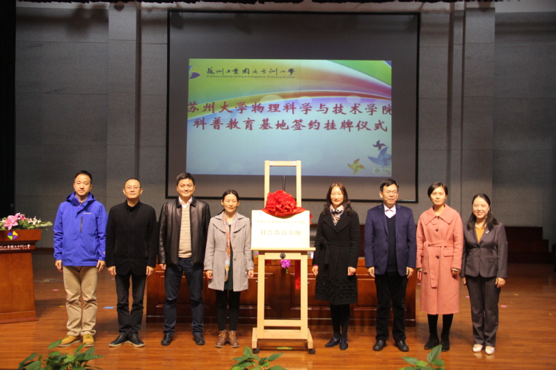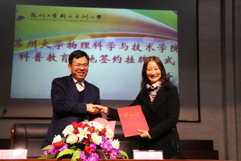 为深入贯彻落实习近平总书记关于“科技创新、科学普及是实现创新发展的两翼,要把科学普及放在与科技创新同等重要的位置”的讲话精神,以实际行动践行“不忘初心、牢记使命”主题教育,在苏州工业园区方洲小学举办第九届数学科学节之际,11月19日下午,黄色影片 和方洲小学开展“黄色影片 科普教育基地”签约、揭牌和科普讲座活动,活动在方洲小学方圆剧场举行。出席本次活动的有方洲小学尤佳校长、金建伟副校长、陈军副校长;物理学院高雷院长、孙德芬书记、赵承良副院长、谢燕兰副书记。活动由方洲小学韩轶副校长主持。