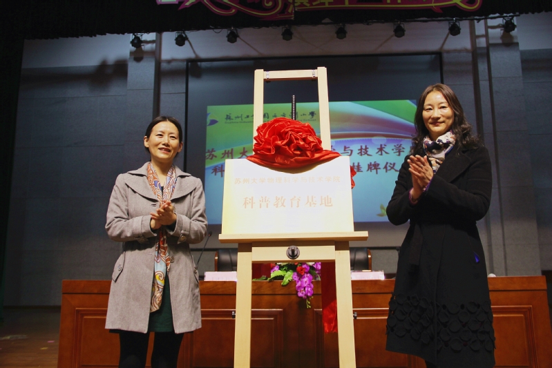 尤佳校长和高雷院长代表双方进行科普教育基地的签约,尤佳校长和孙德芬书记共同为科普教育基地揭牌。