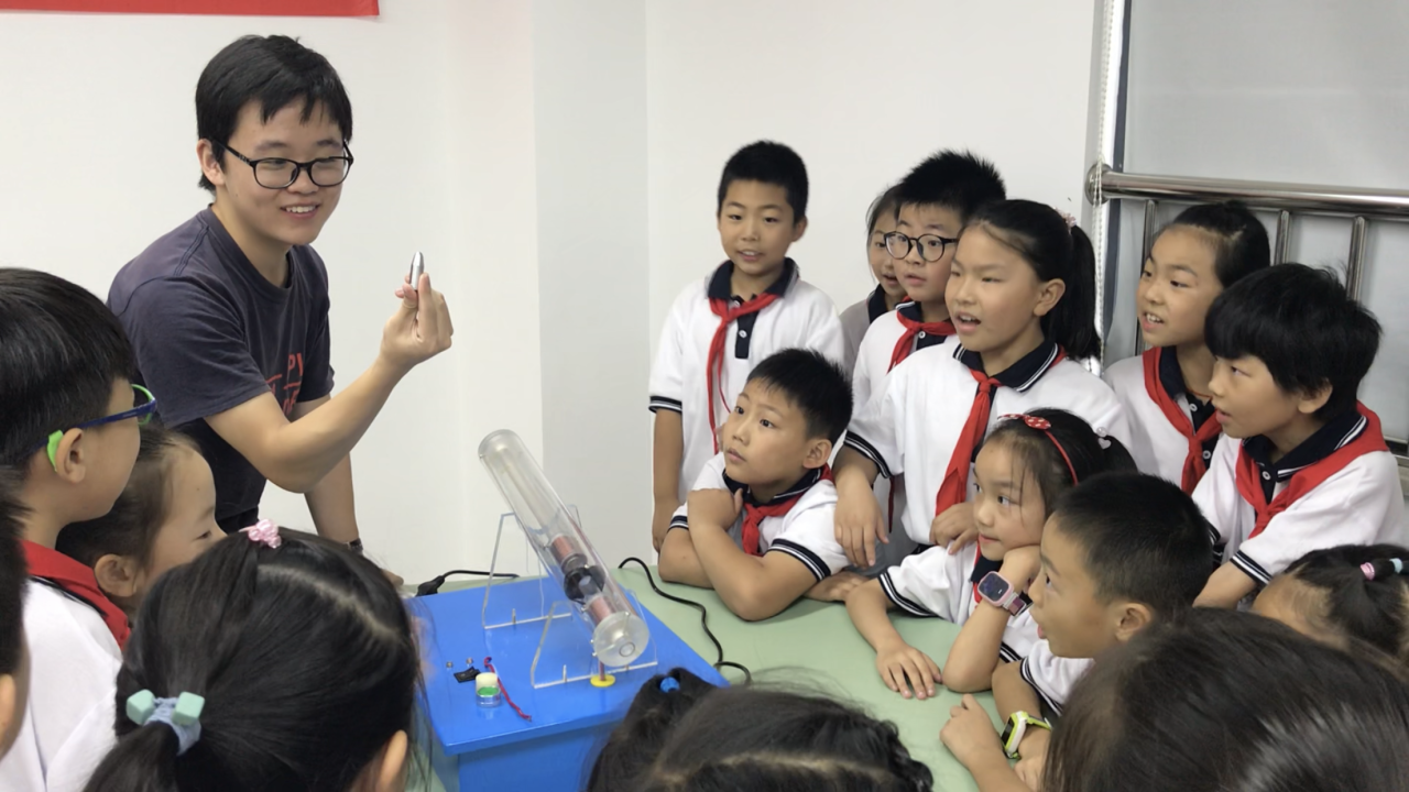 课堂上,志愿者们从力、热、光、电、声五个方面分别向学生们展示了锥体上滚、喷泉、辉光球、人体电池、电磁炮等科学实验,带领他们理解其中的物理原理,并让每位小朋友都动手体验,孩子们的学习热情异常高涨,直到下课都不愿离开,同学们围着志愿者,期待地追问下一次科学课的时间。