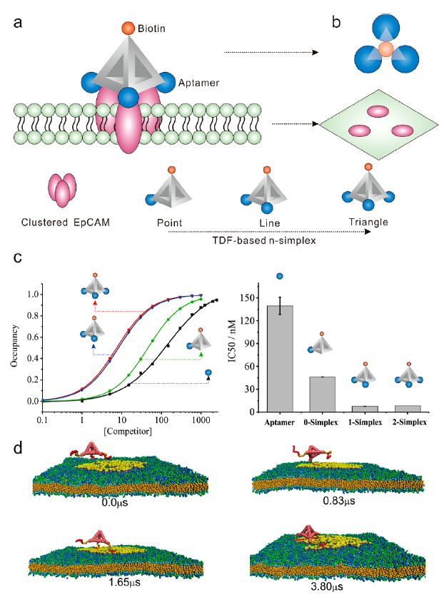 在这项工作中,左小磊课题组采用自组装框架核酸合成了具有特定结构的拓扑适配体,将循环肿瘤细胞的识别模式由单一结合作用提升至拓扑结构诱导的多价结合作用,且该方法具有可编程设计的优点。此外,他们在实验中还发现带有三个适配体的TDF结构(2- simplex)不仅显示出与细胞黏附蛋白(EpCAM)更强的结合亲和力,而且能防止细胞内吞,是最为理想的高效捕获循环肿瘤细胞的DNA材料。为了进一步从微观和介观尺度上理解2-simplex的高吸附能力和低内吞效率, 丁泓铭副教授、马余强教授采用耗散粒子动力学模拟方法构建和刻画了不同TDF结构(0-simplex,1-simplex,2-simplex)与细胞的相互作用过程。他们借鉴化学中的成键思想,在模拟中提出了TDF-EpCAM的单键、双键、三键思想——当它们之间仅形成单键的情况下,尽管TDF能够吸附到细胞膜的EpCAM区域,但是TDF还有比较大的空间自由度(单键能够自由旋转),依然有可能接触到细胞膜上的其他区域从而被细胞内吞;而当它们间形成双键尤其是三键的情况下(双键、三键不能自由旋转),TDF能够牢固地吸附在EpCAM区域,从而极大地降低细胞内吞效率。相关模拟结果很好地解释了实验中的现象。