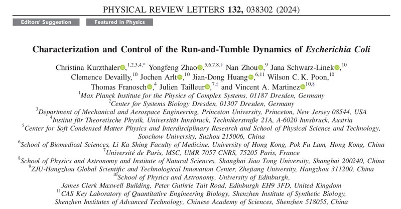 该工作涉及活性物质理论、光学实验和合成生物学三个不同领域的深入合作,展示了跨学科研究的重要性。马克斯普朗克研究所课题组组长Christina Kurzthaler博士,浙江大学周楠研究员,爱丁堡大学Jana Schwarz-Linek博士、Clemence Devailly博士、Jochen Arlt博士,香港大学黄建东教授,爱丁堡大学Wilson C. K. Poon教授,因斯布鲁克大学Thomas Franosch教授,麻省理工学院Julien Tailleur副教授,爱丁堡大学Vincent Martinez博士均参与了该工作。其中Christina Kurzthaler与赵永峰主要承担了该技术的理论构建与数据分析,Vincent Martinez与Jana Schwarz-Linek主要承担了细菌培养与显微成像实验,周楠在工程菌构建和定量表征中作出了重要贡献。该工作受到了深圳市孔雀计划与国家重点研发计划的支持。