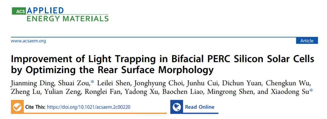近日,国际能源类知名学术杂志Solar RRL和ACS Applied Energy Materials报道了学院邹帅助理研究员(共同通讯作者)/苏晓东教授(共同通讯作者)在高效单晶太阳电池表界面微结构构筑方面取得的研究成果,题目分别为“Ultrafast Random-pyramid texturing for efficient monocrystalline silicon solar cells”和“Improvement of Light Trapping in Bifacial PERC Silicon Solar Cells by Optimizing the Rear Surface Morphology”。