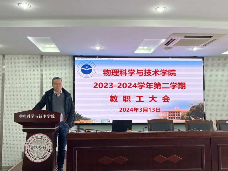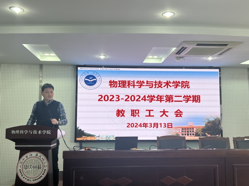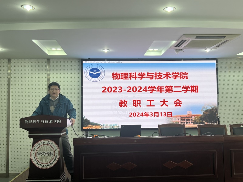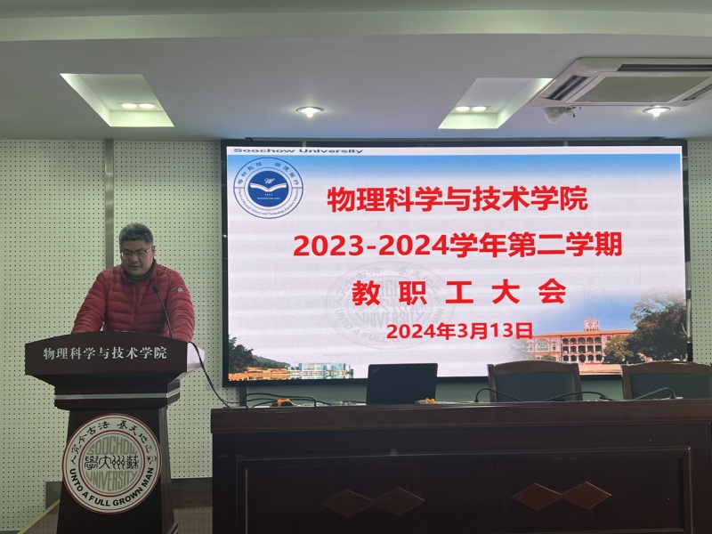 李亮院长向全体教师通报了学院2024年工作计划并就近期的重点工作进行了布置。李院长围绕人才队伍建设、平台建设和学科建设三个主要方面谈了学院在2024年的发展建设思路,希望全体教师能“顺势而为、转型升级”,围绕国家重大发展战略,聚焦科研方向,开展有组织的科研工作,在主要科研方向上形成几个强大的科研队伍,不仅做好基础研究,也积极开展应用研究,进一步提升苏大物理学科的影响力,同时在平台建设和教学工作方面也要争取新的突破。