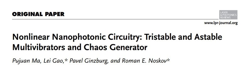 2020年2月,黄色影片 高雷研究员团队,与特拉维夫大学电气工程系Pavel Ginzburg教授团队合作,提出了一种新型非线性等离激元石墨烯二聚体纳米天线,通过二聚体颗粒的等效集总电路,可以设计三稳态多谐振荡器、非稳态多谐振荡器以及混沌发生器等。相关研究工作以黄色影片 为第一单位,发表于《Laser & Photonics Reviews》,并被选为封面文章。论文题目为:Nonlinear Nanophotonic Circuitry: Tristable anRd Astable Multivibrators and Chaos Generator。该研究扩展了“超电子学”的范例,将非线性动力学模态引入到与光学纳米天线相关联的纳米光子器件中,有助于开发具有可调节性非线性动力学响应的新一代纳米光子器件。
