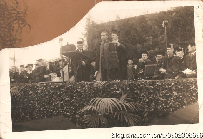 家里还有一张很有意思的照片,这是父亲从加州理工学院留学毕业时,导师给他穿博士服、戴博士帽拍的,小密立根校长坐在旁边。照片的左上角缺了一角,其实缺失的部分是美国国旗,“文革”期间,他为了保留照片,便将美国国旗剪掉,至今,这张缺了角的照片一直留存着。
