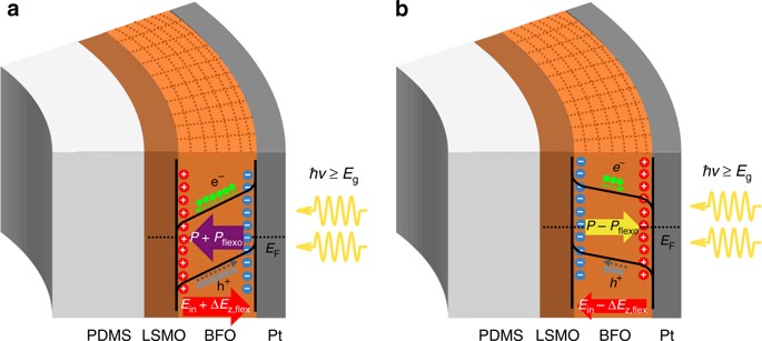 挠曲电效应描述的是应变梯度诱导的电极化现象以及电场梯度诱导的材料应变现象,是一种特殊的力电耦合效应,广泛存在于生物、柔性材料中,近年来在传感、驱动、能量采集等应用领域展示出了巨大的应用前景。2018年,Marin Alexe课题组首次在Science杂志上提出了挠曲电光伏效应(flexo-photovoltaic)的概念,即利用应变梯度引起的中心对称破缺产生自发的体光伏效应,从传统光伏效应的角度理解,就是应变梯度引起的内电场能够自发分离电子-空穴对,形成光电流。虽然,挠曲电光伏效应是否能够真正提升太阳能电池的效率仍有待商榷(例如王中林院士就在ACS Nano上发文对此表示质疑),并且先前的工作是基于扫描探针的微区测量,容易造成测量数值的误差和假象。在这项工作中,我们首次在宏观器件中实现了用挠曲电效应产生的内电场来调节铁电材料中的光电导。通过制备自支撑BiFeO3薄膜,并将其集成到柔性衬底上,我们成功展示通过完全柔性器件,就可以实现对光电导和铁电光伏效应的连续调控,并对此传感器件的各项性能指标进行了详细的表征。这项工作为挠曲电效应的实际应用开辟了新的方向。