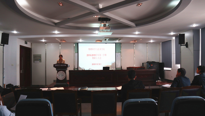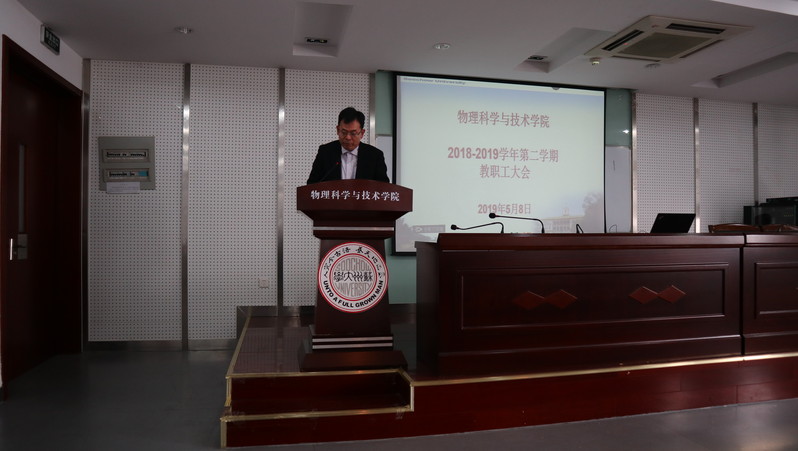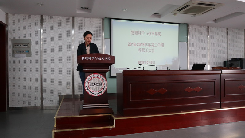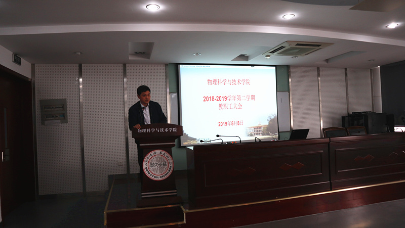 2019年5月8日下午,物理学院在物理科技楼409会议室召开了本学期第二次全体教职工大会,会议由孙德芬书记主持。本次学院大会主要有三项议程:方亮副院长作物理学(师范)专业第二级认证的动员报告、各位院领导介绍各自分管工作、孙德芬书记作“立足立德树人、构建三全育人大格局”的主题报告。