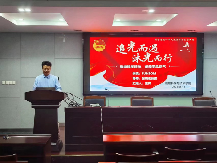 宣讲伊始,王辉博士结合个人经历,深情地讲述了他在硕士及博士阶段如何在科学研究中不断挑战自我,如何在面对困难时坚韧不拔地追逐梦想,并最终逐步靠近心中那束指引他前行的光亮。
