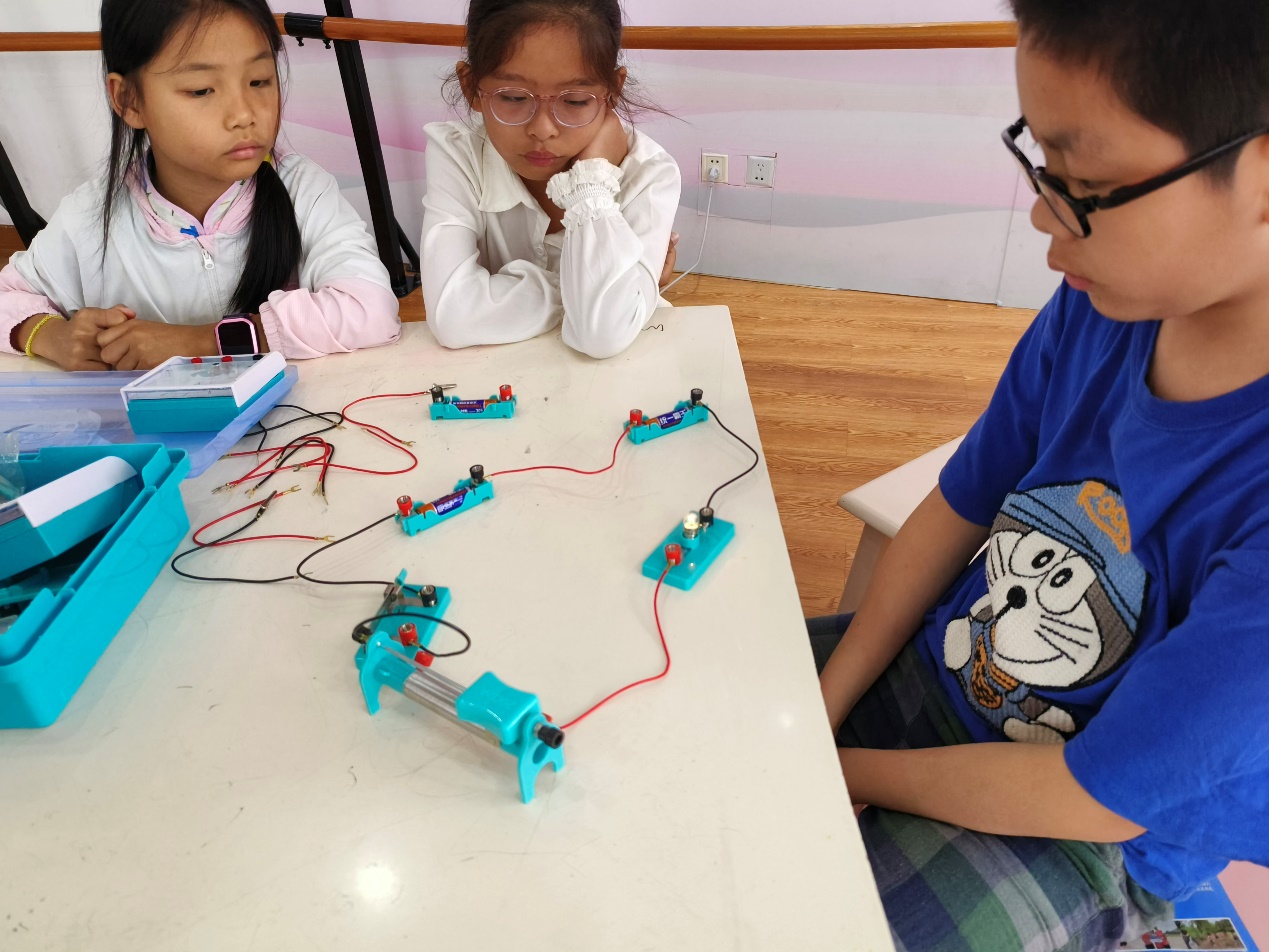 第一节课的主讲人是刘晨茜,她为同学们带来的是电路,带领同学学习认识电路。首先她拿出电源,小灯泡等向同学们介绍每个器材的名字,同时在黑板上画出对应图标,让同学们能够看懂简易电路图。接着她带领同学们拼接简单电路,尝试利用电池盒点亮小灯泡 ,在刘晨茜的讲解下,同学们两两合作,很快都完成了实验。