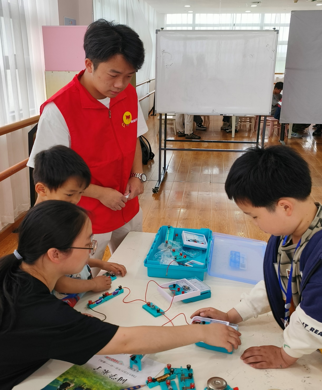 随后,刘晨茜同学带领学生们尝试在电路中加入开关来帮助开关电路,控制电路。在孩子们用同样的方法加入了开关后,她继续讲解简易电路图。她先在黑板上画出了标准的简易电路图,向同学们一一讲解电路图上的要素,随后再邀请同学自己尝试。在同学们完成了自己的电路图后,各组的助教老师们一一检查了孩子们的拼接成果,指出问题并帮助修改。在此之后,刘晨茜又带领同学们尝试触发了短路、断路两种电路故障,引导同学们思考电路中的电流流动是怎样的形式。最后,在同学们的积极配合下,结束了电路的教学。