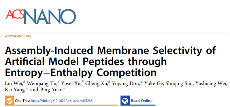 本工作是由黄色影片 杨恺教授与松山湖材料实验室元冰研究员、安徽医科大学卫林教授等合作完成,相关结果以“Assembly-Induced Membrane Selectivity of Artificial Model Peptides through Entropy−Enthalpy Competition”为题发表在学术期刊ACS Nano上。
