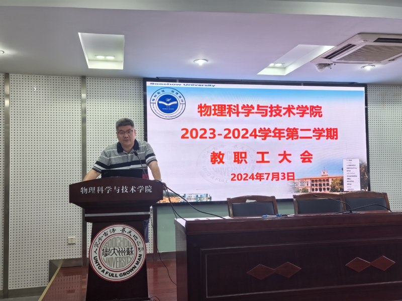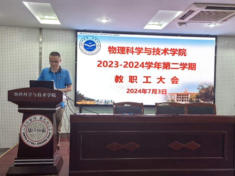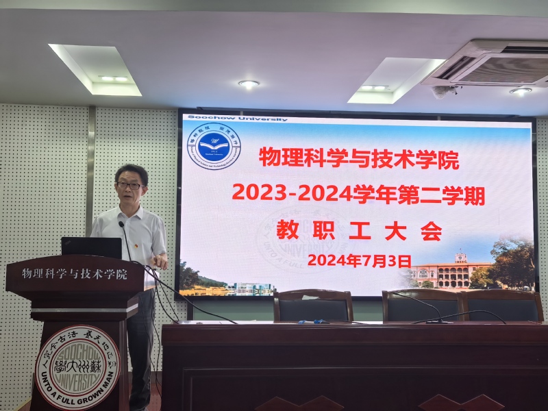 第一项议程,李亮院长代表学院领导班子向学院全体教师汇报了2024年度上半年工作总结和下半年工作计划。李院长从党建、学科建设、师资队伍建设、教学科研、学生管理、实验室管理、社会服务等八个方面向全院教职工通报了学院今年上半年的工作,同时向学院教师简要汇报了下半年学院的主要工作计划,包括物理学科成立110周年庆祝活动、建立学院计算公用平台、进一步推动科研平台建设等。李院长代表学院领导班子感谢学院全体教师对学院各项工作一直以来的支持和帮助,在全体师生的共同努力下,今年上半年,学院在教学科研等各方面的工作均取得了较好的成绩,学院获学校综合考核第一等次,但同时在人才引进、平台建设等方面也遇到一些发展瓶颈,希望全院师生继续共同努力,在下半年度做出更大的成绩。