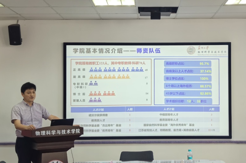 赵承良副院长从学院的发展历史、师资情况、党建情况、学科建设、人才培养、科学研究、学生工作和社会服务等方面对苏大物理学院作了详细介绍。