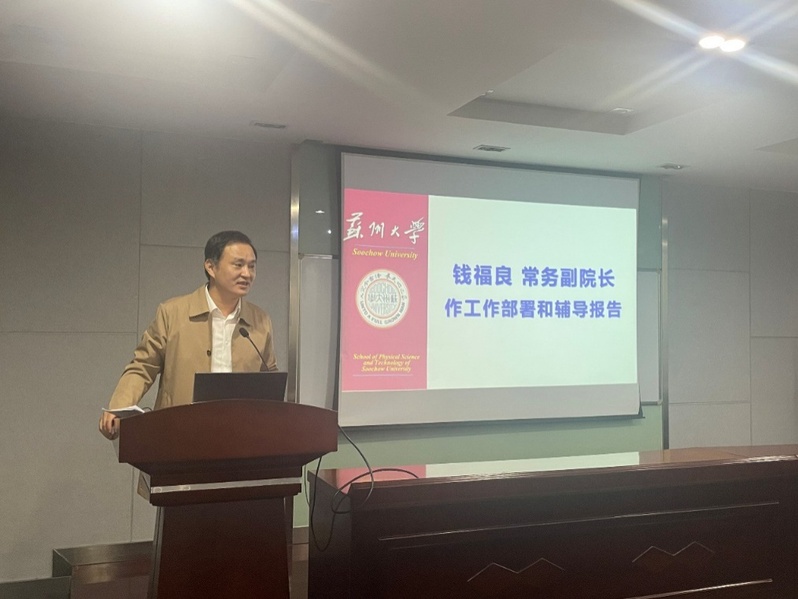 钱福良常务副院长对各位专家一如既往支持科技工作表示感谢,充分肯定物理学院近几年在科研工作高质量发展上取得的成绩,尤其是近年来每年均有国家级人才项目获批以及今年的重大项目突破,科技工作量质同升。同时希望学院未来在平台建设、科技成果转化等方面有新的突破,推动学校一体化科研创新工作落实落细,并预祝两院科技工作更上一层楼。